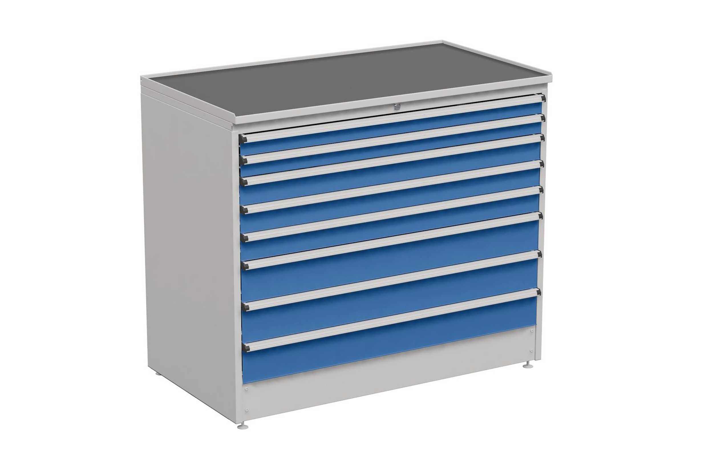 Tootekood: 615 07 002 Korpus ja sahtlid terasplekist, pinnatöötlus pulbervärviga, korpus helehall (RAL 7035), sahtlid sinised (RAL 5007). Alumiiniumist käepidemetel on kohad etikettide jaoks. Sahtlikapi teisaldamine on lihtne kahvelkäruga, sokli esi- ja tagaplaat on eemaldatavad. Jalad reguleeritavad.