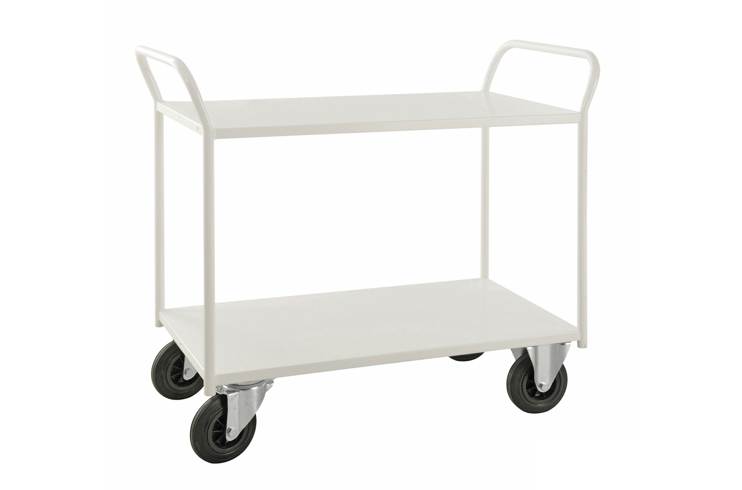 Täielikult keevitatud tugev riiulkäru ilma servadeta, 2 riiulit. Ideaalne raskemate esemete jaoks. Mõõdud: 1080 (S) x 450 (L) x 975 (K) mm Ratta läbimõõt: 160 mm Kandevõime: 400 kg