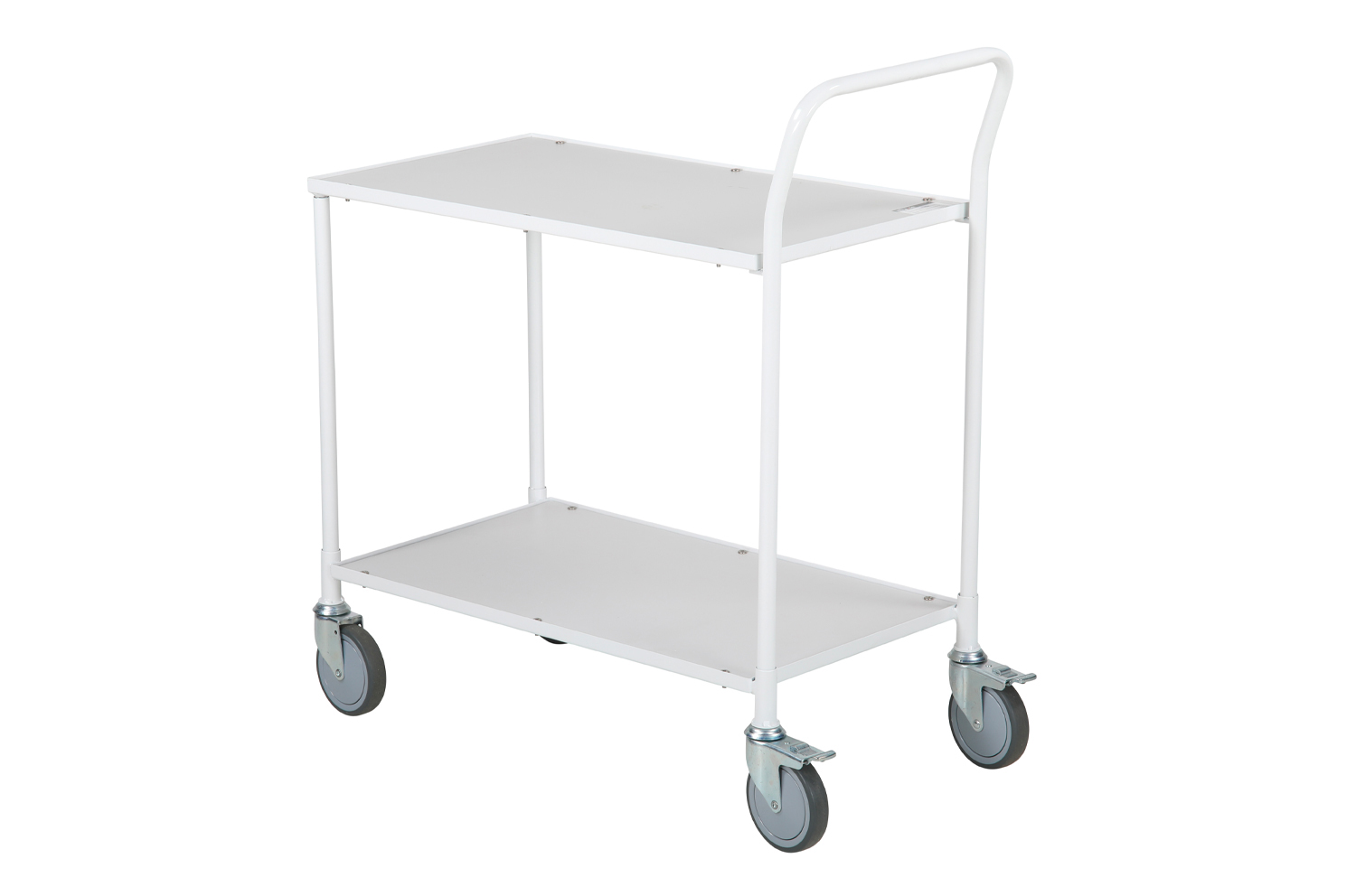 Serveerimiskäru, 830 x 465 mm, 150 kg Kahetasapinnaline lamineeritud riiulitega serveerimiskäru. Käru raam valmistatud Ø 100 mm valgest terastorust.