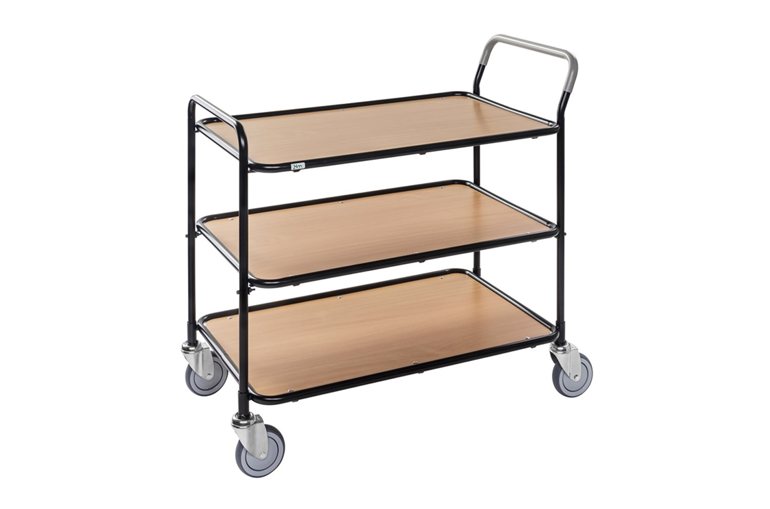 3 riiuliga väiksem riiulkäru. Plastikust käepide mugavaks haaramiseks. Lamineeritud riiulid. Mõõdud: 1020 (S) x 555 (L) x 965 (K) mm Rattad: 4 pöördraamiga ratast Ratta läbimõõt: 125 mm Kandevõime: 225 kg