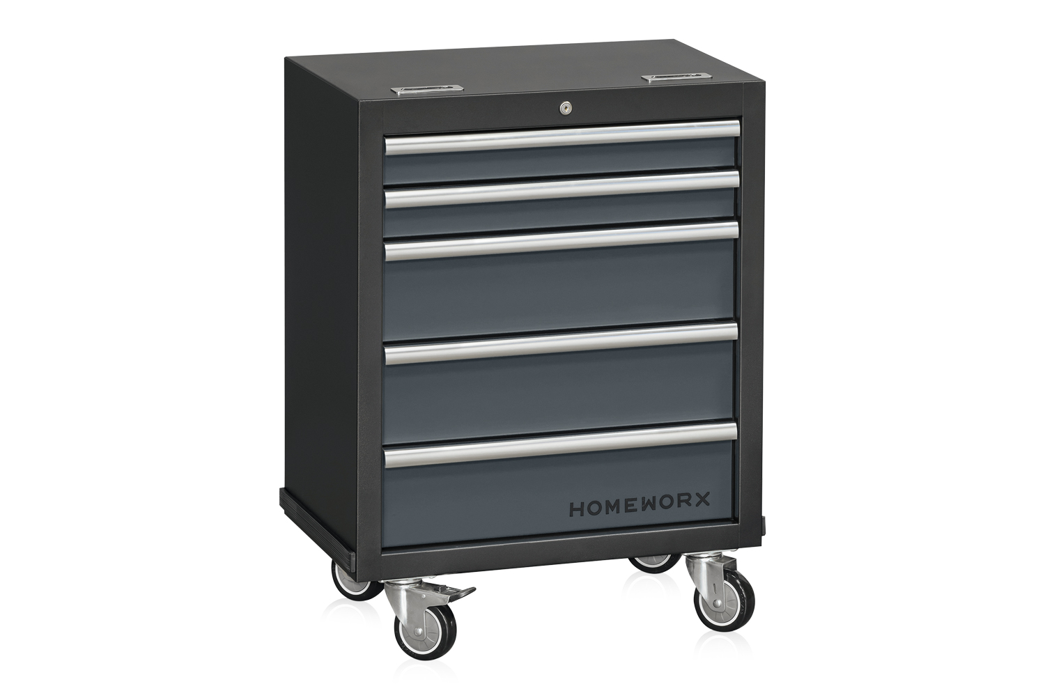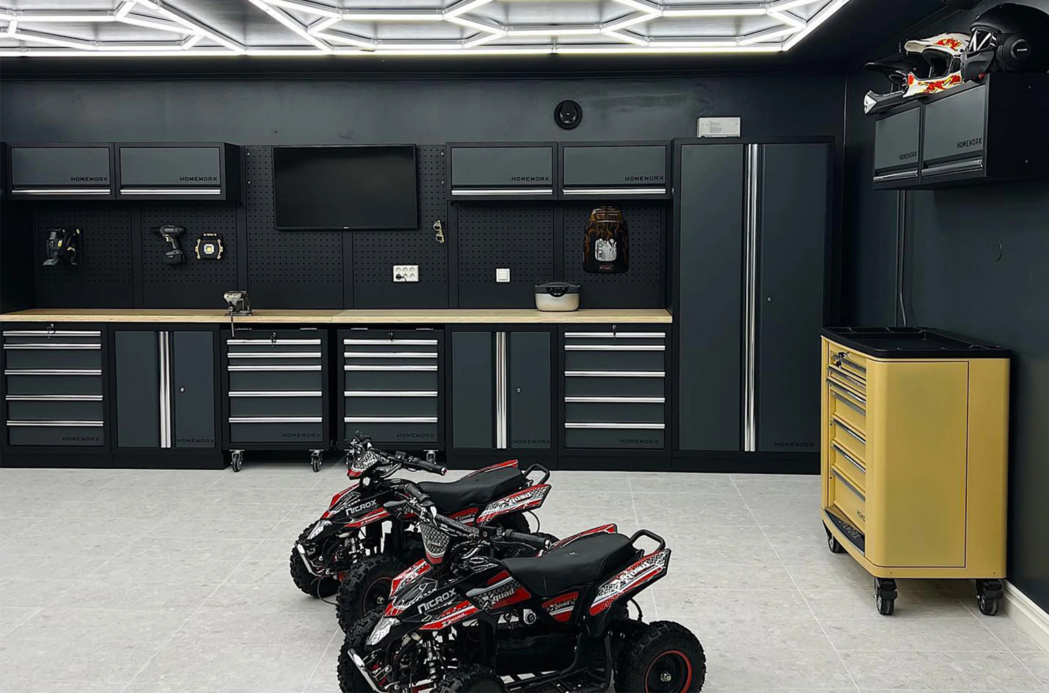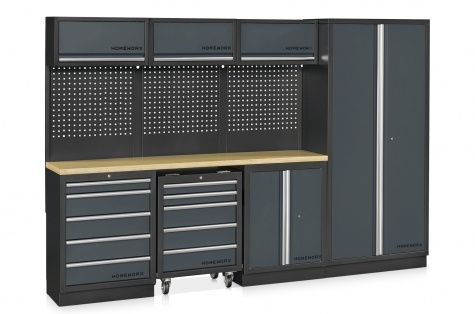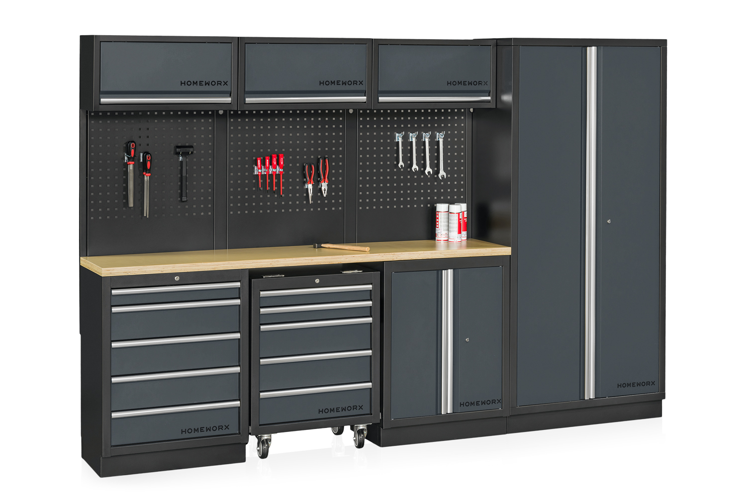Tootekood: H-40-0002-3 Uuenda oma garaaži või töökoda komplektiga Homeworx Deluxe. Töökojakomplekti kuulub kolm seinakappi, kolm perforatsiooniga seinapaneeli, kiudplaadist tööpind, üks viie sahtliga põrandakapp, üks viie sahtliga ratastega sahtliboks, üks kahekordsete ustega põrandakapp ning üks kõrge kapp. Sahtlitel on kuullaagritel siinid.