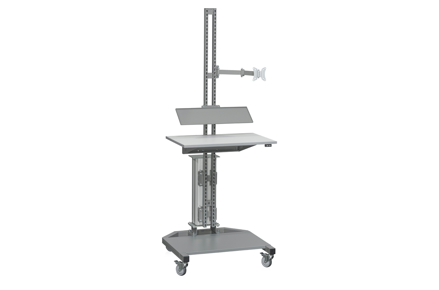 Tootekood: 9-590-136 Elektriline tööjaam, mis sobib lihtsamateks töödeks või IT-jaamaks. Tööjaam on varustatud kõrgust reguleeritava hallist melamiinist tööpinnaga (800x600x24 mm), 4 pöördrattaga, millest 2 on piduritega (ratta läbimõõt 100 mm), lameekraani kinnituse ja liigendatud varrega, klaviatuuririiuli ja alumise riiuliga. Tõstekiirus koormuseta 35 mm/sek. Ühendatakse 230 V/50 Hz vooluvõrku. Perforeeritud postid võimaldavad paigaldada standardseid lisatarvikuid. Maksimaalne kandevõime on 50 kg jaotatud koormust.