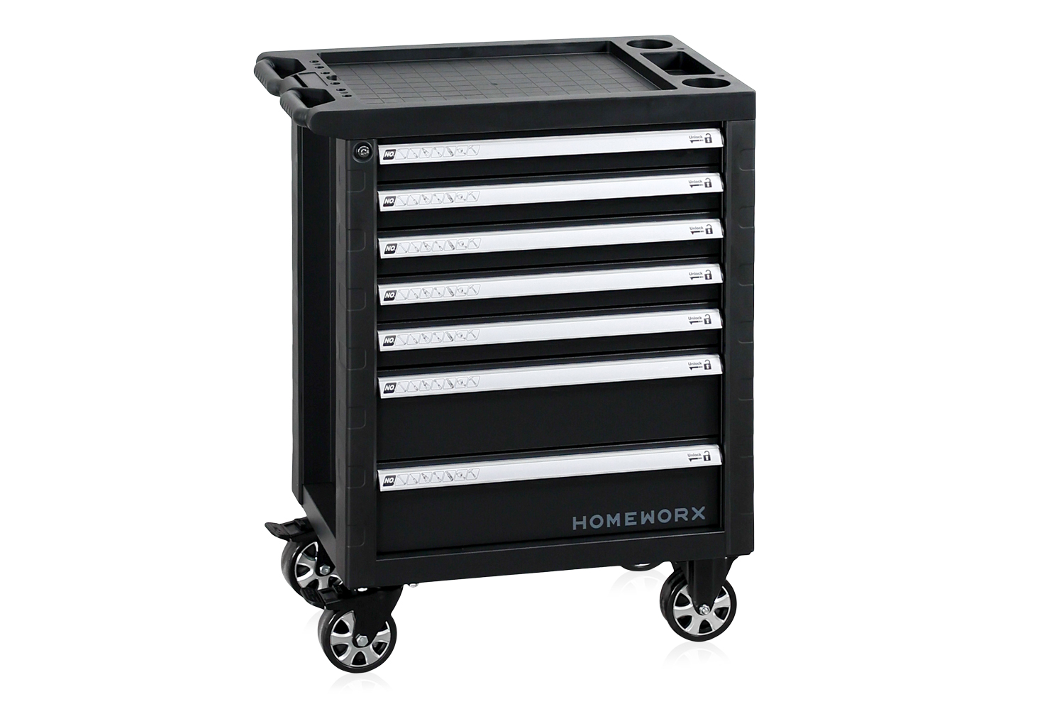 Tootekood: H-10-0002-7 Homeworx tööriistakäru X2 seitsme sahtliga on ideaalne käru garaaži või väiksemasse töötuppa. Käru müüakse ilma tööriistadeta, mis teeb selle täiuslikuks neile, kellel on juba palju tööriistu, kuid kes vajavad head kohta nende hoiustamiseks. Käru stiilne must disain (RAL 9005) loob professionaalse ja atraktiivse välimuse igas töökojas või garaažis.
