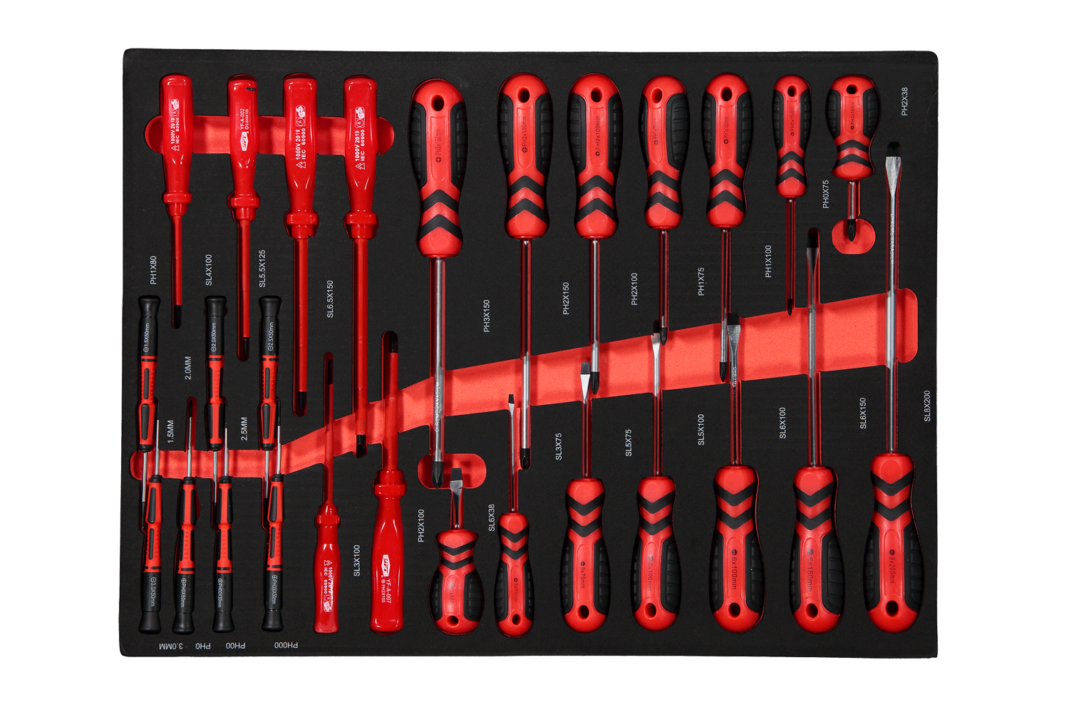 Sahtlites olevad tööriistakomplektid koosnevad 135 tükist, mis on valmistatud kroom-vanaadiumterasest. Need on kenasti paigutatud vahtsisudesse, kus igal tööriistal on oma koht ja märgistus, mis tagab korrastatud ja organiseeritud töökoha. Käru stiilne beež/kollane (RAL 1002) ja must (RAL 9005) disain loob professionaalse ja atraktiivse välimuse igas töökojas või garaažis.