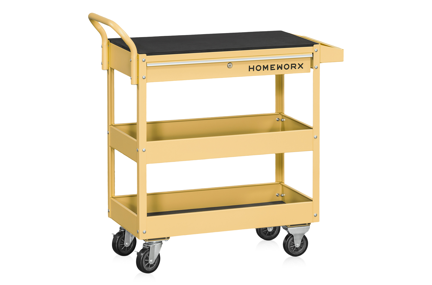 Tootekood: H-10-0005 Homeworx töökojakäru on mugav käru, mida on lihtne liigutada ja mis pakub suurepäraseid hoiustamisvõimalusi, sobides ideaalselt kokkupanekuks või töökojas kasutamiseks. Käru on valmistatud pulbervärvitud metallist ning sellel on kolm riiulit. Ülemise riiuli all on kuullaagritel siinidega lukustatav sahtel. Ülemine riiul koos kummimatiga sobib suurepäraselt tööpinnaks.