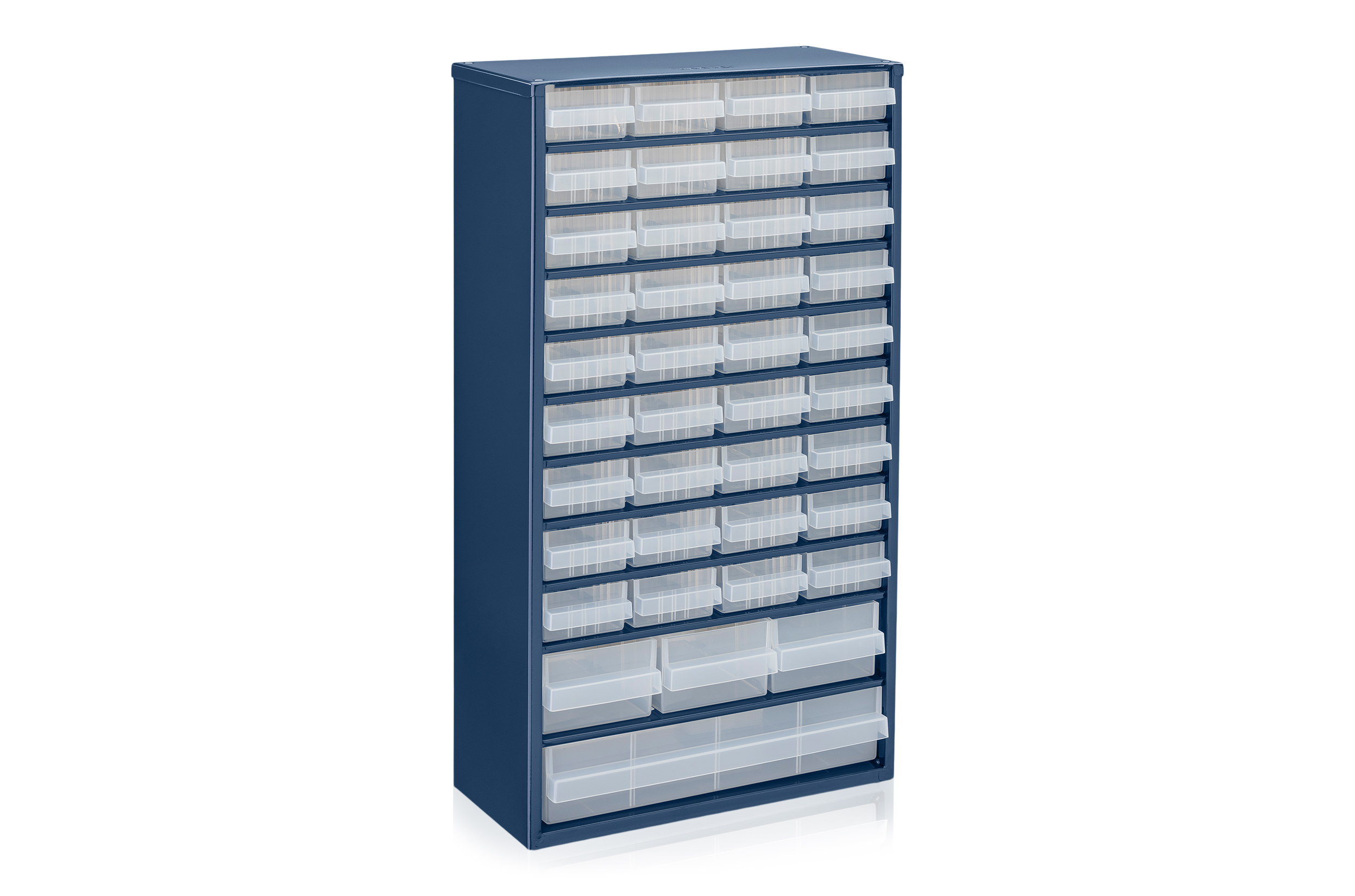 Tootekood: H01-001-001-01 Praktiline laegasriiul väikeste sahtlitega, mis sobib kruvide ja teiste väiksemate detailide hoiustamiseks ja sorteerimiseks. Riiul on valmistatud lakitud metallist ning sellel on läbipaistvad plastsahtlid, mis võimaldavad sisu hõlpsasti näha.