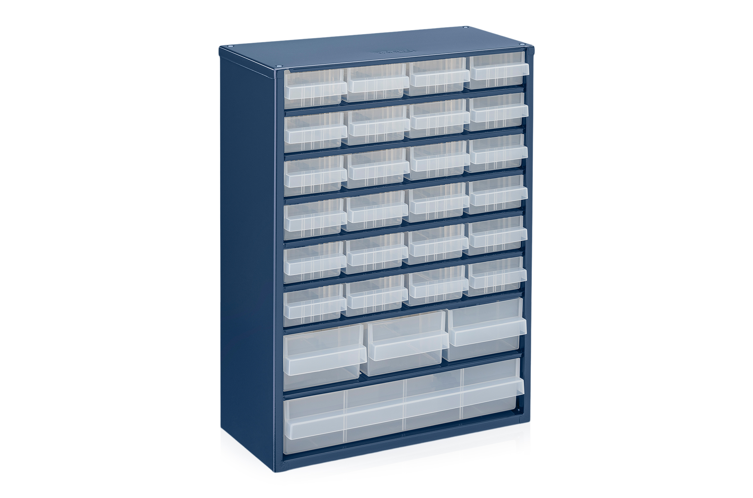 Tootekood: H01-001-001-02 Praktiline laegasriiul väikeste sahtlitega, mis sobib kruvide ja teiste väiksemate detailide hoiustamiseks ja sorteerimiseks. Riiul on valmistatud lakitud metallist ning sellel on läbipaistvad plastsahtlid, mis võimaldavad sisu hõlpsasti näha.