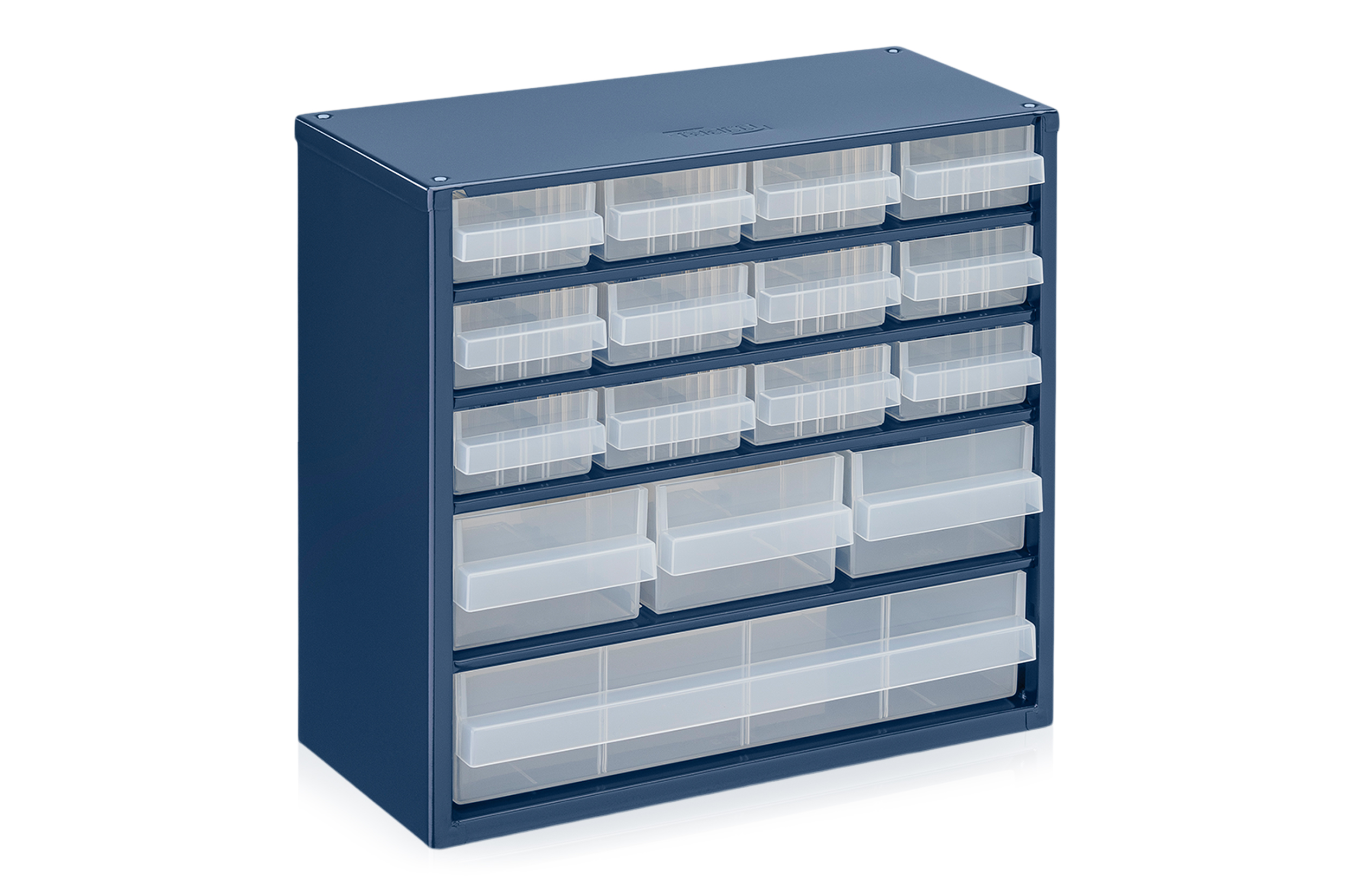 Tootekood: H01-001-001-03 Praktiline laegasriiul väikeste sahtlitega, mis sobib kruvide ja teiste väiksemate detailide hoiustamiseks ja sorteerimiseks. Riiul on valmistatud lakitud metallist ning sellel on läbipaistvad plastsahtlid, mis võimaldavad sisu hõlpsasti näha.
