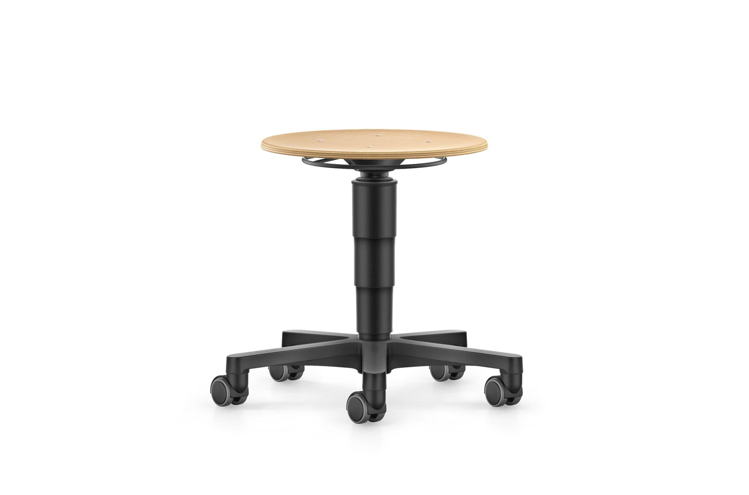 Taburet on valmistatud vineerist ning varustatud ratastega, mis on võimalik asendada liugjalgadega.