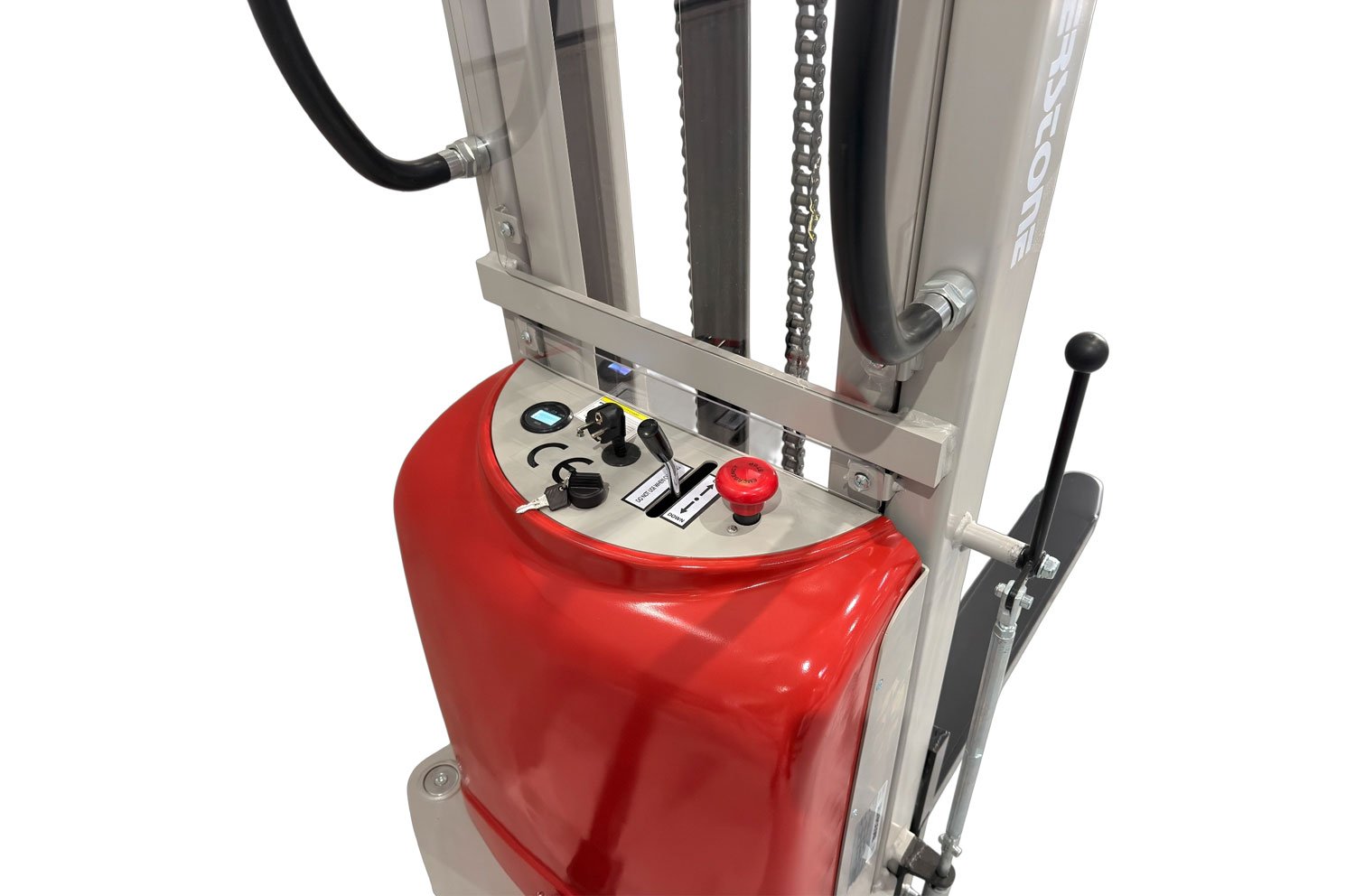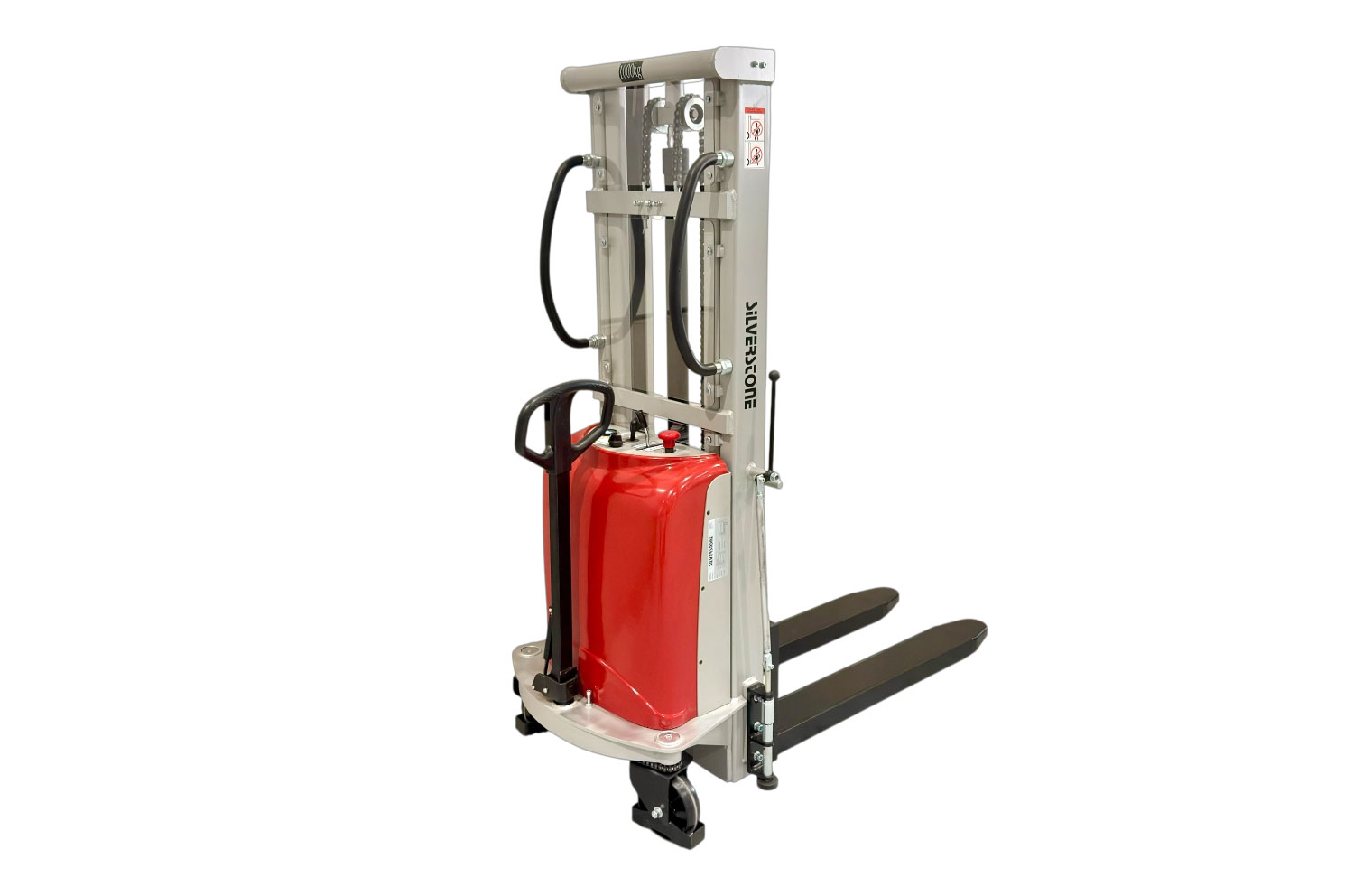 Semi-electric stacker suited for intensive handling and continuous lifting. Compact design ensures a small turning radius. Fast lifting/lowering speeds. Easy and smooth steering makes the stacker safe and easy to operate. Service-friendly assembly of hydraulics, electrics and batteries. Large battery, 150Ah/12V, for many working hours per charging. The perfect choice for high productivity requirements in confined spaces. - Capacity 1000kg